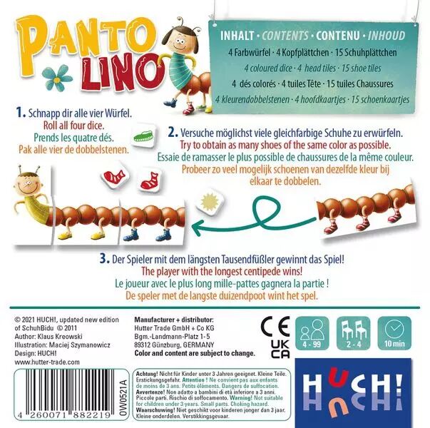 Réf. : 4260071882219 Lancez les dés et essayez de récupérer un maximum de chaussures pour constituer votre mille-pattes. Le mille-pattes le plus long gagnera la partie.