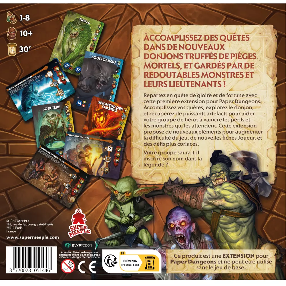 Repartez en quête de gloire et de fortune avec cette première extension pour Paper Dungeons (nécessite le jeu de base). Accomplissez vos quêtes, explorez le donjon, et récupérez de puissants artefacts pour aider votre groupe de héros à vaincre les périls et les monstres qui les attendent. Cette extension propose de nouveaux éléments pour augmenter la difficulté du jeu, de nouvelles fiches Joueur, et des défis plus coriaces.