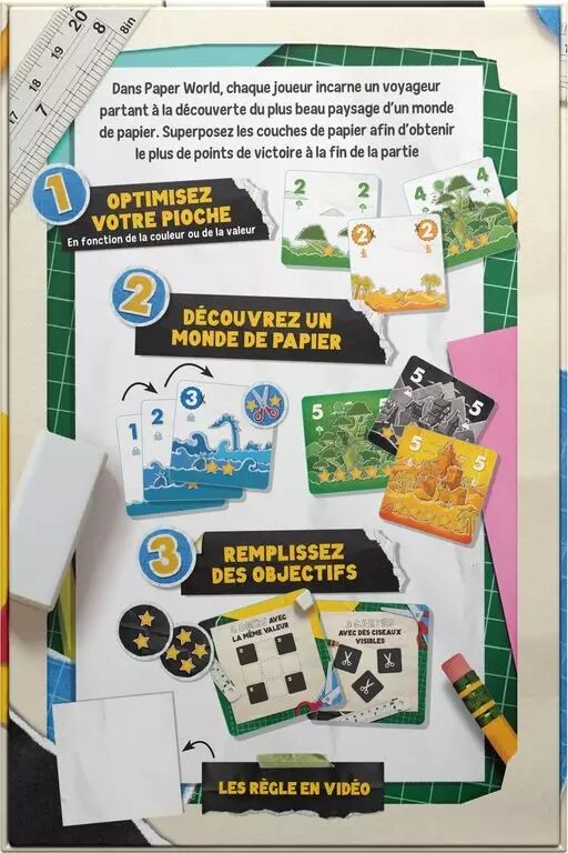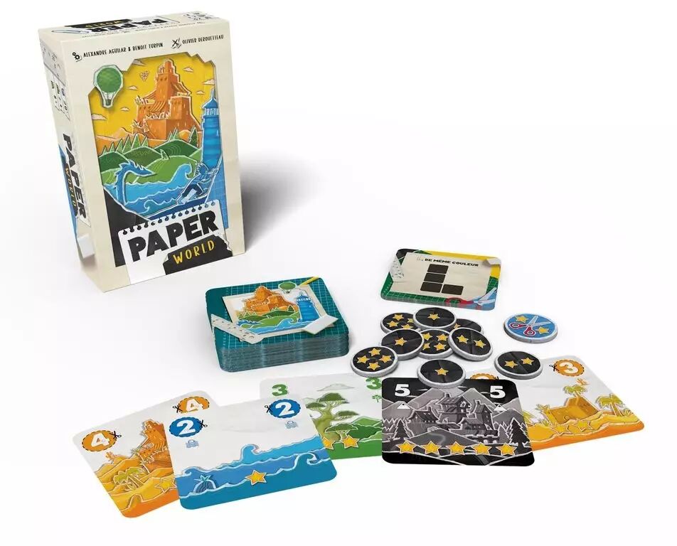 Les règles de Paper World sont accessibles : prenez ou posez des cartes de même couleur ou valeur pour construire votre paysage. Les choix tactiques sont cruciaux : empilez astucieusement vos cartes pour maximiser vos points tout en atteignant les objectifs communs. Une mécanique fluide qui mêle réflexion et plaisir immédiat.