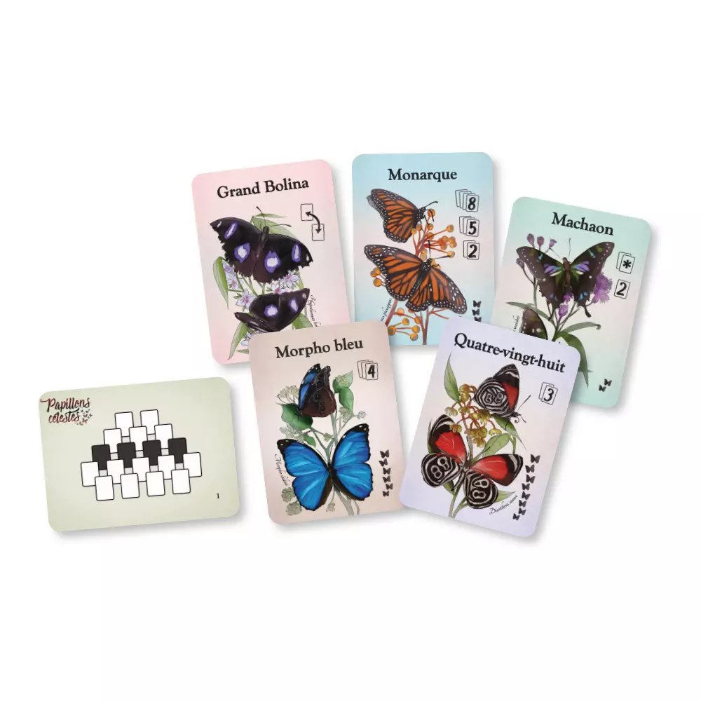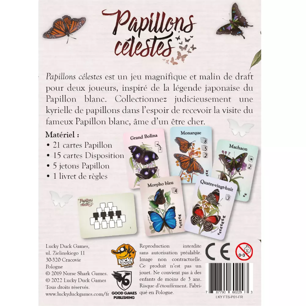 Papillons Célestes est un jeu pour 2 joueurs, composé de 3 à 5 manches. À chaque tour, les joueurs collectent des papillons pour gagner des points de victoire, soit en groupe, soit seuls. Le joueur qui a accumulé le plus de points de victoire à la in d’un tour reçoit un jeton papillon blanc, une visite d’un être cher perdu. Le premier joueur à collecter 3 jetons papillons blancs est le gagnant.