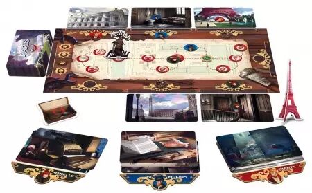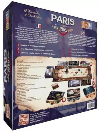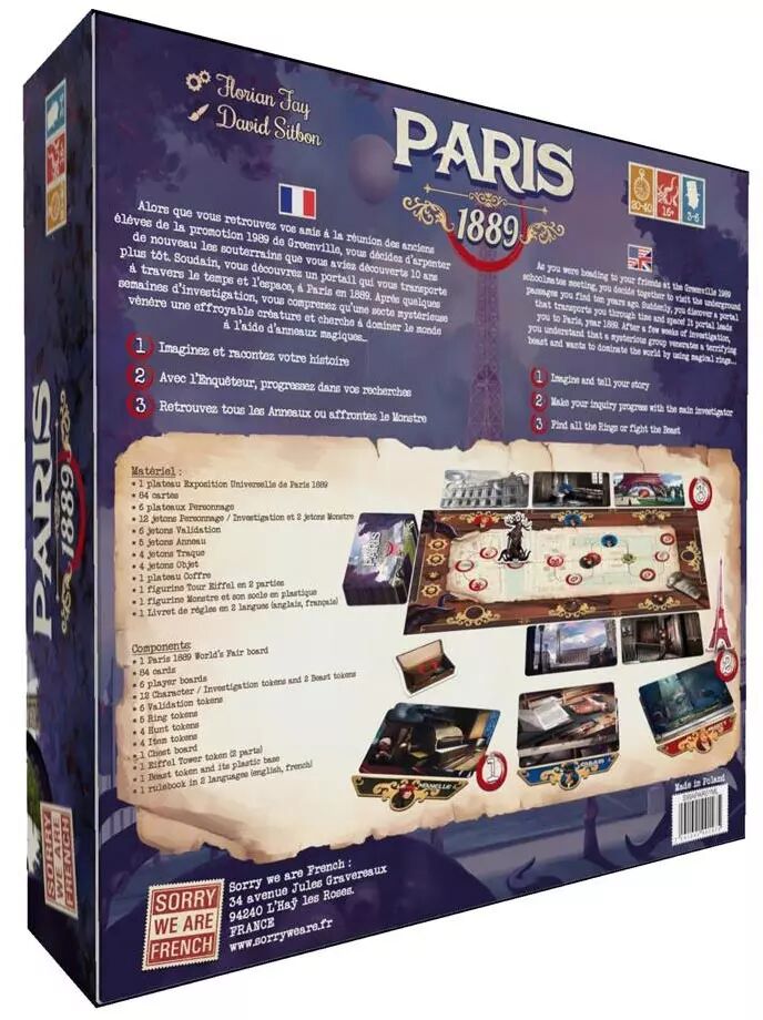 Contenu : - 1 plateau Exposition Universelle de Paris 1889 - 84 cartes (80x120mm) - 6 plateaux Personnage - 12 jetons Personnage / Investigation et 2 jetons Monstre - 6 jetons Validation - 5 jetons Anneau - 4 jetons Traque - 4 jetons Objet - 1 plateau Coffre - 1 figurine Tour Eiffel en 2 parties - 1 figurine Monstre et son socle en plastique - 1 Livret de règles en 2 langues (anglais, français)