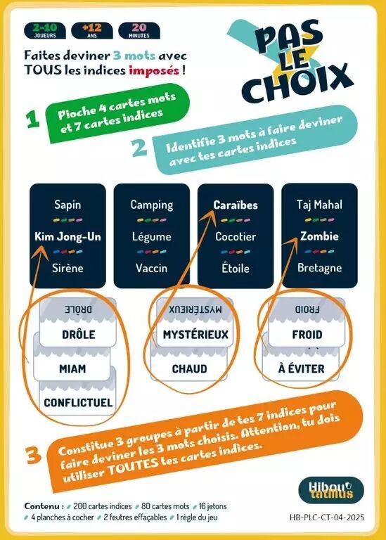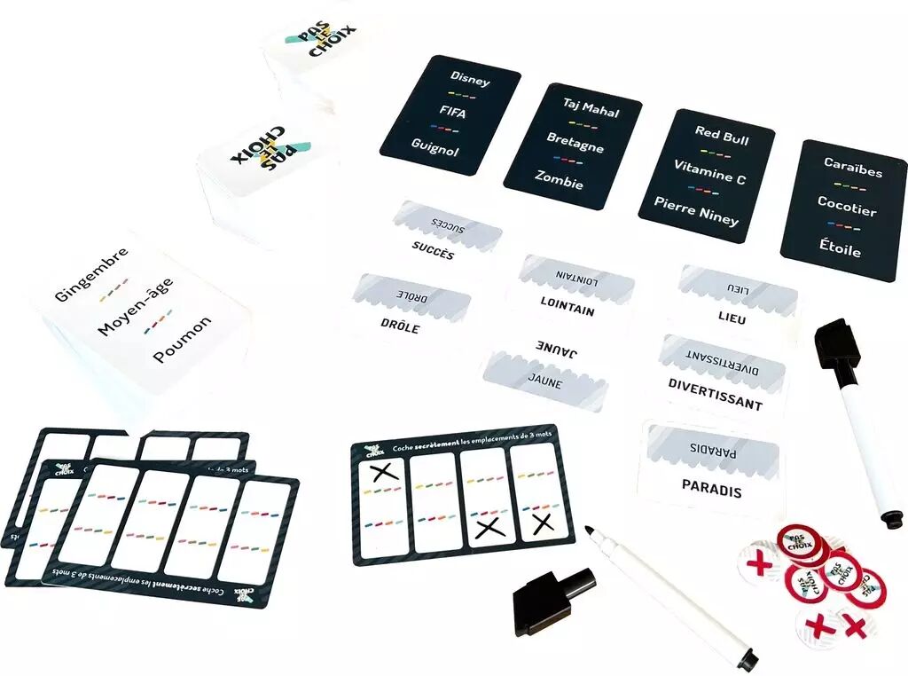 Pas le Choix comprend 200 cartes indices, 80 cartes mots, 2 feutres effaçables, 4 planches à cocher, 16 jetons punch et une règle claire. Tout est pensé pour que chaque partie soit un moment de complicité, d’humour et de challenge accessible à un large public.