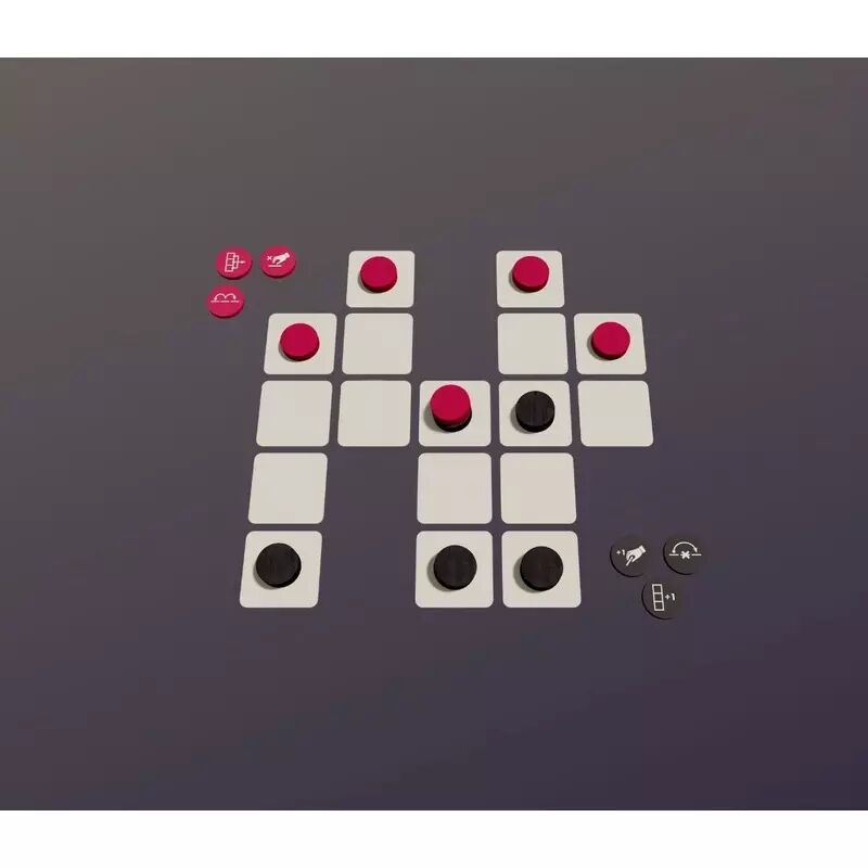 Chacun votre tour, vous déplacez un disque sur une tuile adjacente et retirez la tuile que vous quittez si celle-ci est vide. Les disques peuvent se superposer, jusqu'à 3 maximum. Les disques vont donc se bloquer et se libérer et le terrain de jeu va se rétrécir. Sauras-tu planifier les meilleurs coups ? Une variante avec des Pouvoirs spéciaux pimenteront encore plus les parties suivantes.