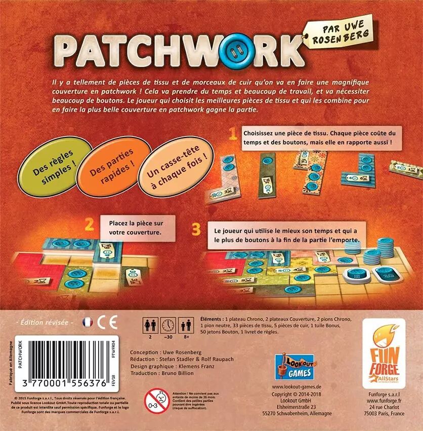 Réf. : PTWFR02 Il y a tellement de pièces et de morceaux de cuir qu'on va en faire une magnifique couverture en patchwork ! Cela va prendre du temps et beaucoup de travail, et va nécessiter beaucoup de boutons. Le joueur qui choisit les meilleures pièces de tissu et qui les combine pour en faire la plus belle couverture en patchwork gagne la partie.