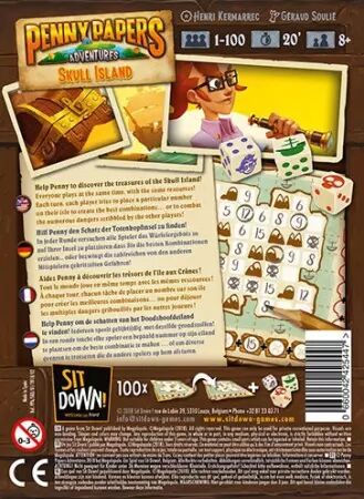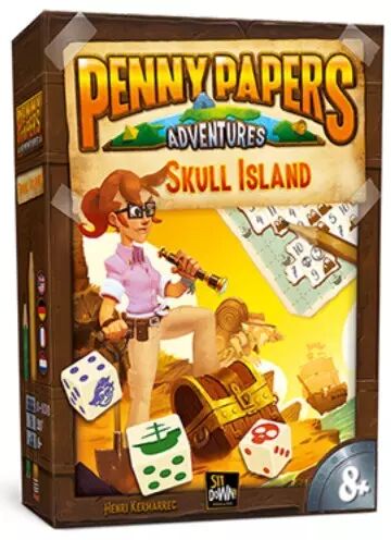 Penny Papers Adventures est une série de petits jeux de stratégie dans lesquels tous les joueurs utilisent le même résultat de trois dés pour explorer un endroit plus complètement que leurs adversaires, en écrivant des nombres dans leur grille de manière optimale pour obtenir le plus de points, Défiez votre capacité à gérer l'espace et utilisez judicieusement les effets spéciaux des dés, Oh, et ne manquez pas une occasion de saboter les grilles de vos adversaires quand des dangers apparaissent! Le nombre de joueurs est illimité, et tout le monde joue en même temps! Dans Skull Island, placez vos résultats sur votre île pour obtenir les coordonnées des plus beaux trésors, tout en déjouant les multiples dangers que les autres joueurs ne manqueront pas de gribouiller sur votre feuille.