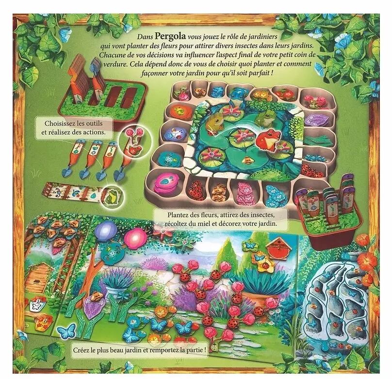 Dès l’ouverture de la boîte, Pergola séduit par la qualité de ses composants : des tuiles épaisses, des meeples en bois colorés (grenouilles, coccinelles, libellules…), et des illustrations dignes d’un carnet botanique. Même le rangement a été pensé pour faciliter la vie, avec un GameTrayz malin qui accueille plus de 200 pièces. Le tout donne envie de s’installer et de voir son jardin s’épanouir tour après tour.