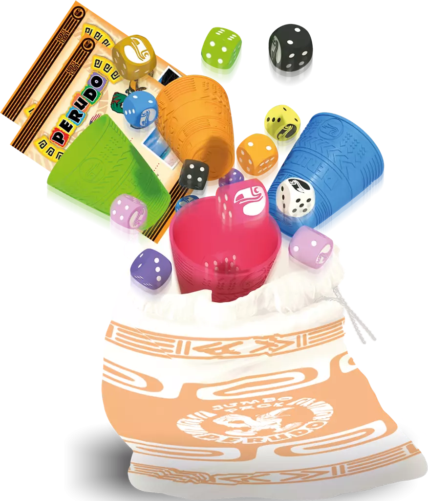 Dans Perudo, vous devez faire preuve de ruse et de bluff pour tromper vos adversaires. Cachez vos 5 dés sous votre gobelet puis au top, secouez-le. Regardez discrètement votre résultat. Le bluff peut commencer?! L'idée est de déterminer combien de dés d'une même face il y a sur l'ensemble des dés de tous les joueurs. Vous connaissez les vôtres, mais devez déterminer ceux de vos adversaires à partir de leurs annonces, attitudes et comportements. Si vous jouez à 10, combien des 50 dés présents sous les gobelets affichent un 6?? Les uns après les autres, les joueurs annoncent un nombre de dés et augmentent le pari sur le nombre présent ou sur la face du dé. Un joueur annonce 12 dés indiquant 3, vous pouvez décider d'augmenter à 13 ou à 14, ou bien de garder le même nombre, mais de parler de dés indiquant 4?! D'autant qu'il ne faut pas oublier les faces Joker qui remplacent n'importe quel nombre. Bluffez, supposez, faites des hypothèses, mais prudence?! Si vous êtes pris en flagrant délit de mensonge, vous perdrez un dé.