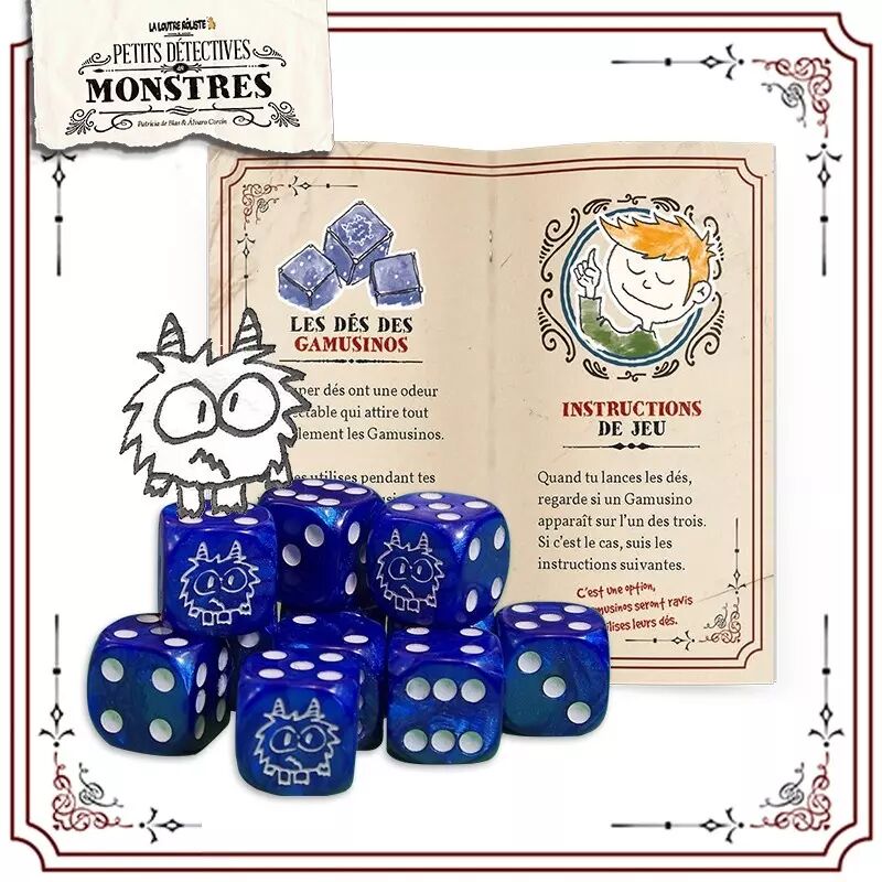 Lorsque ces 3 dés sont lancés et que des GAMUSINOS apparaissent, il se passe d’étranges choses ! Mais que se passe-t-il si on obtient des Gamusinos ? Tout dépendra du nombre de Gamusinos obtenus, comme décrit dans le livret de règles additionnelles inclus dans le blister des dés !