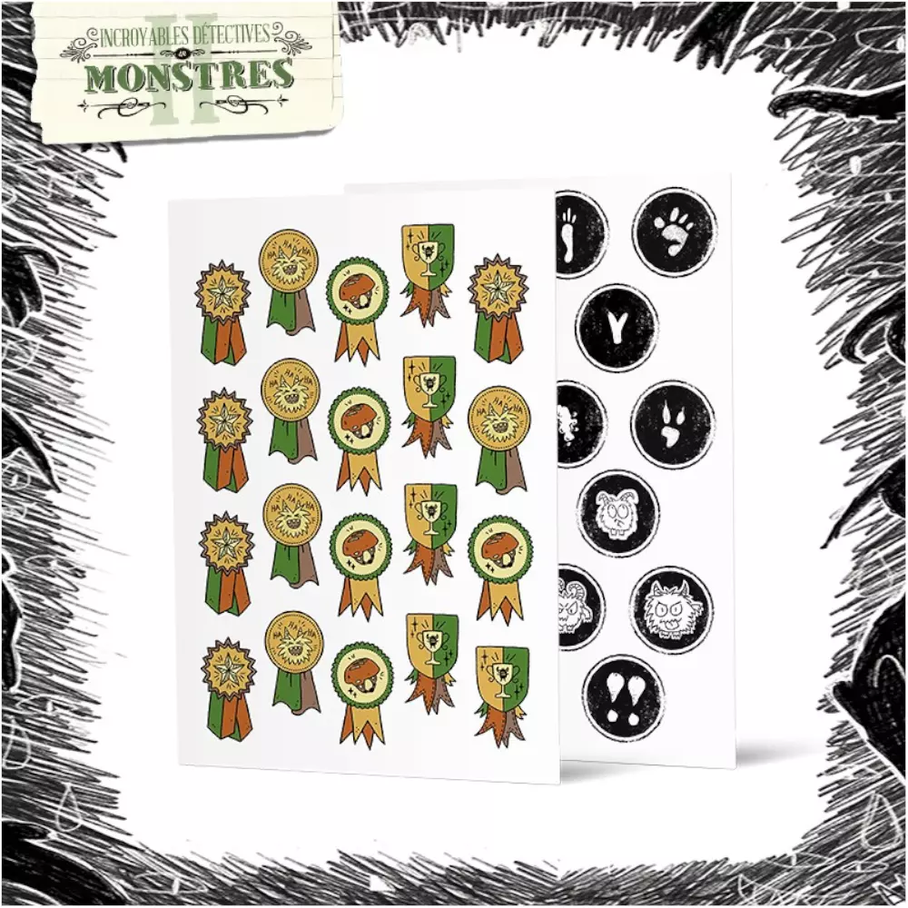 UNE PLANCHE DE PIONS : ces pions à détacher reprennent les empreintes des Monstres présentés dans Incroyables Détectives de Monstres – livre de base, des Gamusinos et les Capacités spéciales des Monstres.
