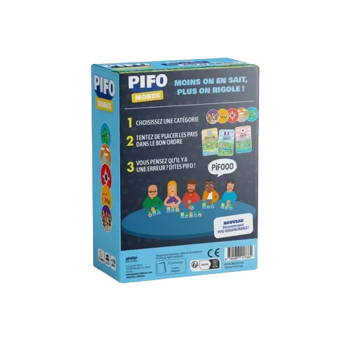 Le principe de Pifo Monde est simple : à chaque tour, un joueur place une carte pays sur la table, en essayant de la positionner dans le bon ordre selon une catégorie définie (population, superficie, âge moyen, etc.). Si le joueur pense que sa carte est à la bonne place, il peut la poser face visible. S'il n'est pas sûr, il peut la poser face cachée et bluffer.