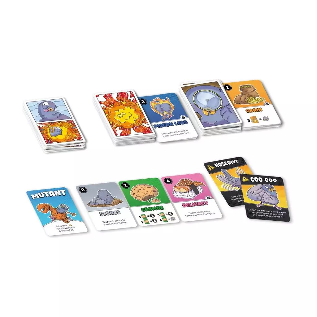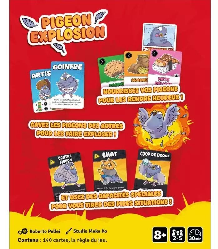 Pigeon Explosion est un jeu de cartes survitaminé où la gourmandise est un vilain défaut... mortel. Chaque joueur commence avec un pigeon devant lui qu'il doit chouchouter. Pour gagner, vous devez rendre vos oiseaux "Heureux". Mais attention : un pigeon trop nourri finit par exploser, vous obligeant à en piocher un nouveau et à recommencer de zéro.