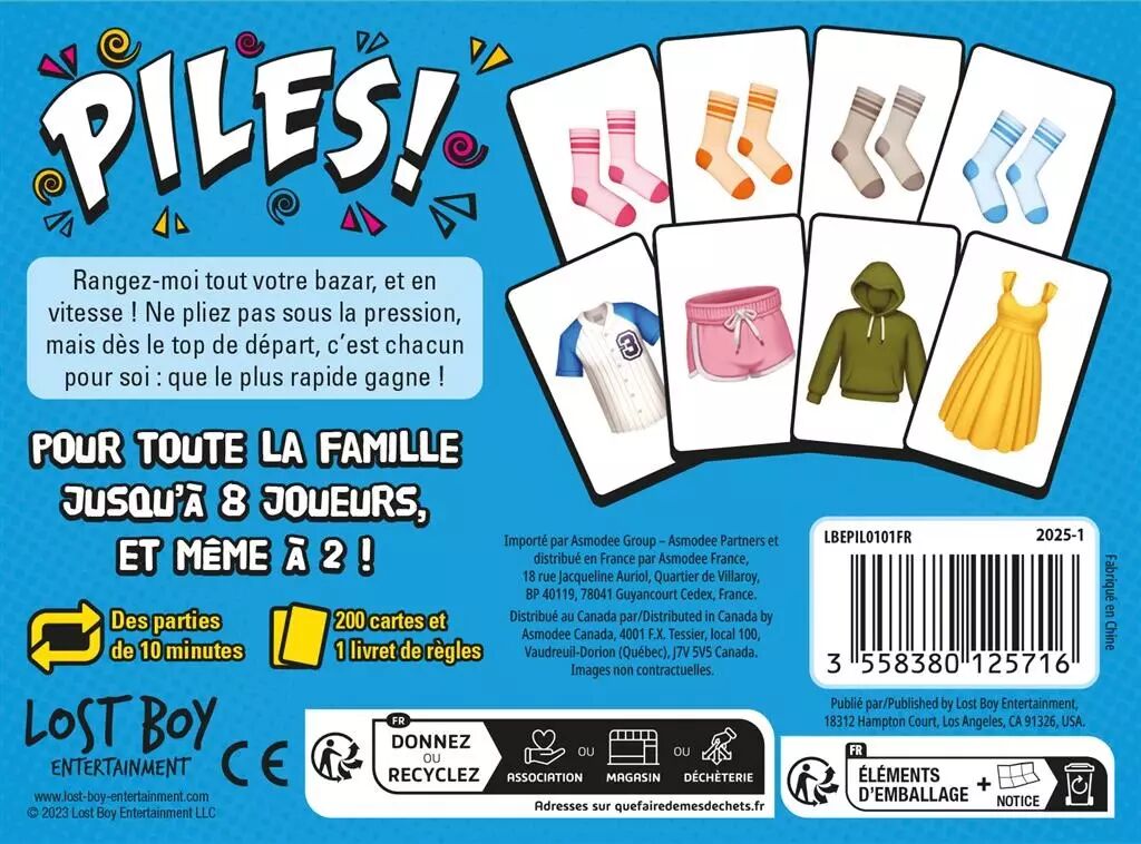 Grâce à son format compact, Piles est parfait pour être emporté partout : vacances, pique-niques ou soirées improvisées. Jouable sur n’importe quelle surface, il s’adapte à toutes les situations. Avec ses cartes colorées et son thème amusant autour des vêtements, il plaira autant aux enfants qu’aux adultes.
