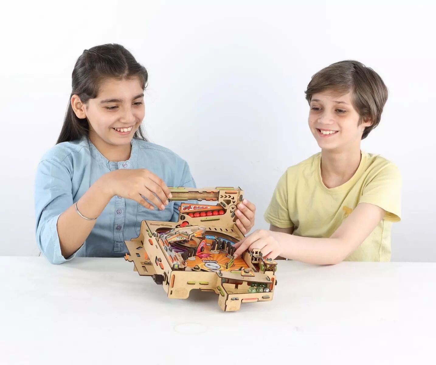 Construisez votre propre Flipper mécanique en suivant pas à pas les instructions du livret. Une fois votre Flipper construit, appuyez sur le lanceur pour lancer la balle sur le terrain de jeu et actionnez les flippers pour frapper la balle et marquer un maximum de points. Vos amis arriveront-ils à surpasser votre high-score ? Découvrez les principes de levier, de transfert d'énergie et de quantité de mouvement.