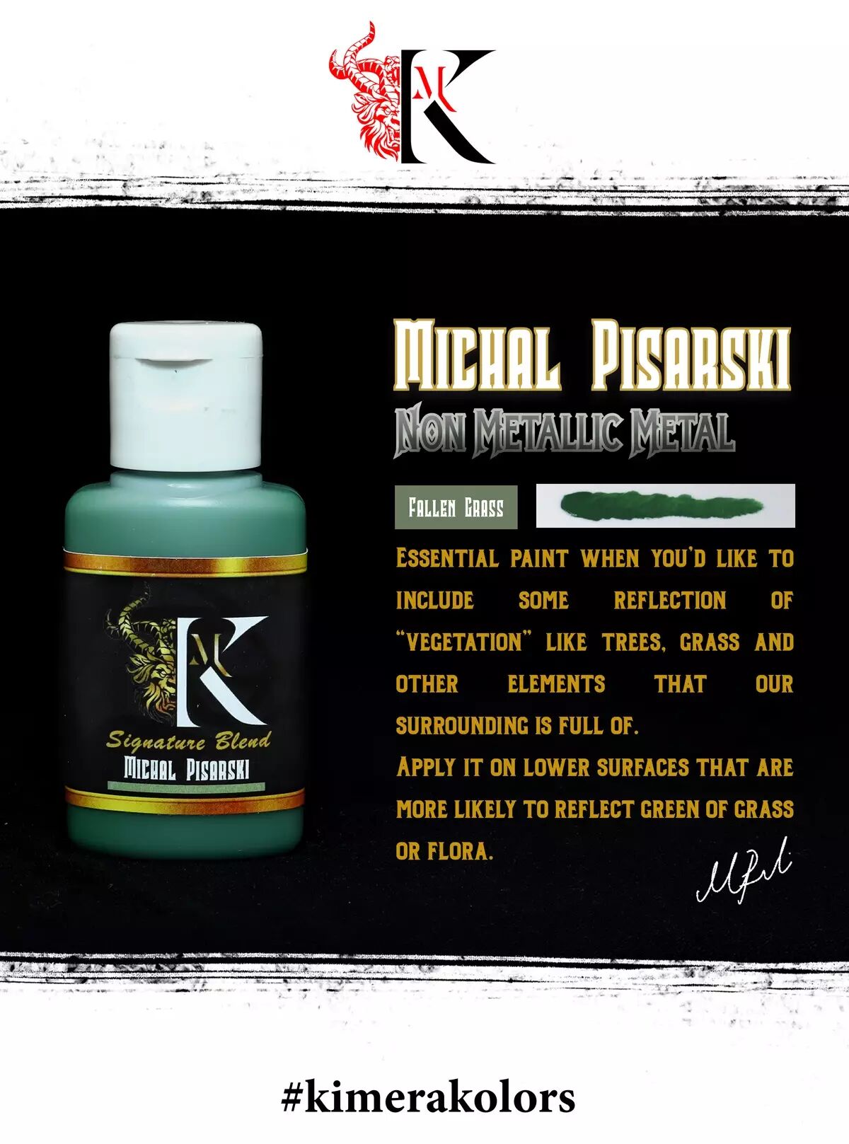 Réf. : KIMCOL33 Pisarski Fallen Grass : Un vert désaturé évoquant l'herbe sèche ou automnale. C'est une nuance organique précieuse pour lier vos figurines à leur socle ou pour peindre des tissus de camouflage réalistes.