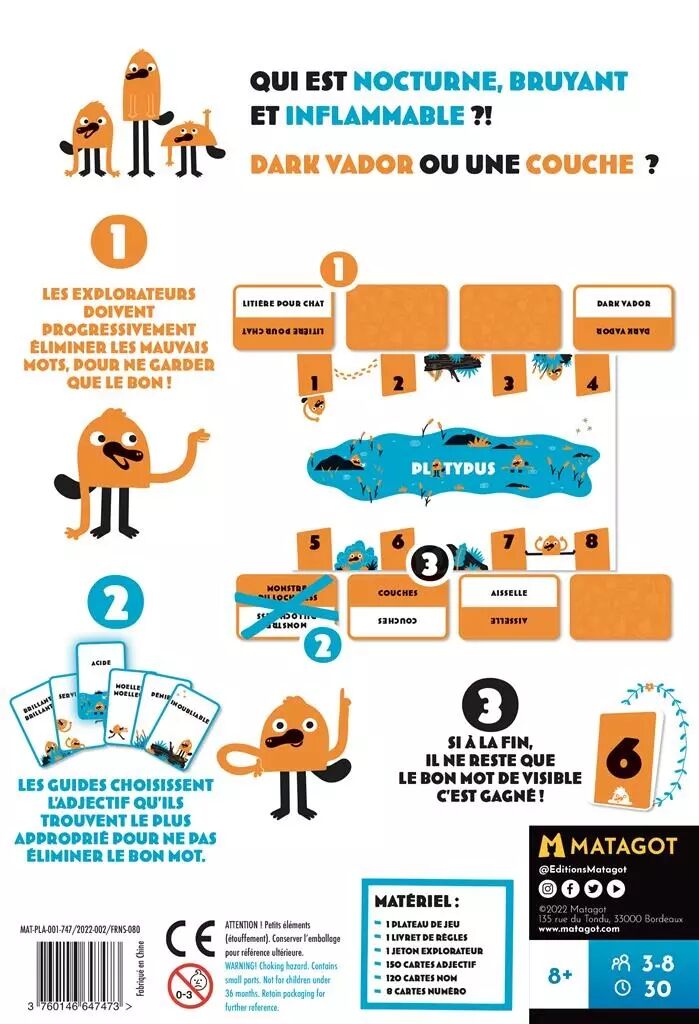 Acide ? Dangereuse ? Énervante ? Une vendeuse de voitures ! Comestible ? Rapide ? Souple ? Captain America ou une autruche ? Dans Platypus, les joueurs coopèrent pour éliminer progressivement les mauvais mots, afin de trouver et d'identifier le Platypus grâce à leurs cartes Adjectif. Entre définitions très personnelles et cartes en main limitées, il faudra parfois avoir de l’intuition et même de l’imagination !