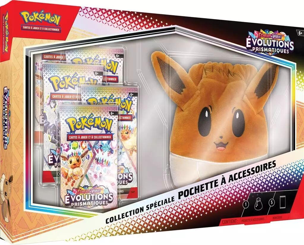 En plus de cet accessoire exclusif, ce coffret vous permet également d’enrichir votre collection grâce à 5 boosters de l’extension Écarlate et Violet – Évolutions Prismatiques.