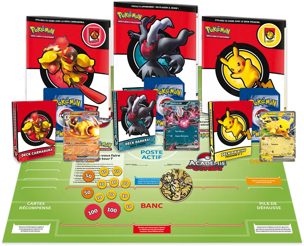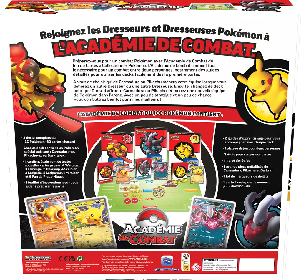 Le Coffret Académie de Combat V3 du Jeu de Cartes à Collectionner Pokémon offre une expérience complète pour les amateurs de combats Pokémon. Ce coffret contient tout le nécessaire pour des affrontements entre deux joueurs, avec des guides détaillés pour chaque deck afin de faciliter l'apprentissage. Chaque deck de 60 cartes inclut un Pokémon spécial puissant. En plus des cartes, le coffret comprend un plateau de jeu, des étuis de rangement, des pièces métalliques et des marqueurs de dégâts. Une carte à code permet également d'accéder au JCC Pokémon Live pour prolonger l'expérience en ligne.