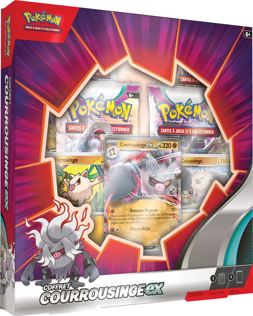 Votre adversaire redoutera la Rancune Rageuse de Courrousinge-ex ! Les dégâts ne font que renforcer ce Pokémon-ex, et il est rejoint par Férosinge et Colossinge pour vous aider à le mettre en jeu tout de suite.