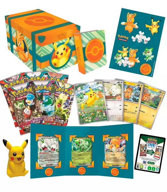 Un monde d’aventures attend les Dresseurs et Dresseuses Pokémon dans la région de Paldea. Parez-vous au combat avec plusieurs cartes promo mettant en vedette des Pokémon mignons mais féroces, puis ouvrez des boosters pour trouver encore plus d’amis ! Vous pourrez également décorer vos accessoires avec des autocollants réajustables, mettre en valeur votre collection dans un mini-portfolio, et serrer un jouet Pikachu amusant !