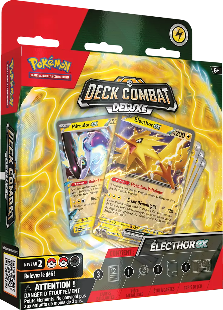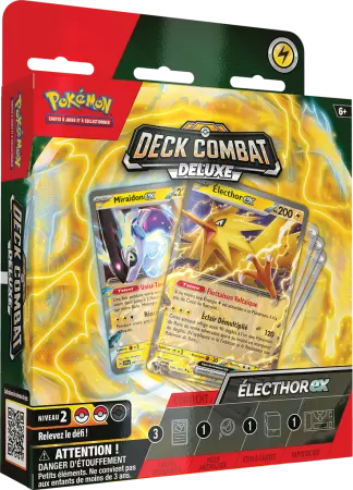 Le nouveau Deck Combat Deluxe du JCC Pokémon offre un défi de taille aux joueurs et aux joueuses qui souhaitent passer à la vitesse supérieure, grâce à ses stratégies avancées et ses cartes puissantes supplémentaires. Chaque deck de 60 cartes contient 3 cartes brillantes et tout ce dont vous avez besoin pour jouer immédiatement. Que le combat Deluxe commence !