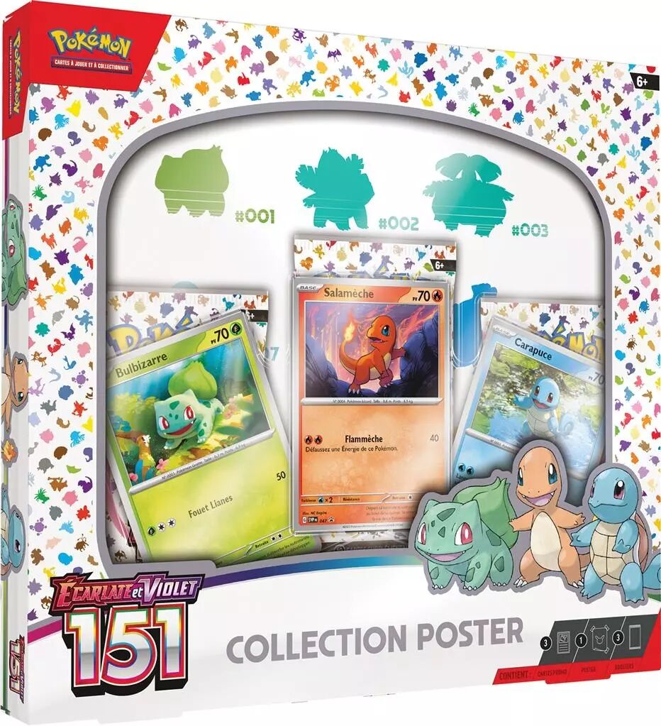 3 cartes promo brillantes de Bulbizarre, Salamèche ou Carapuce, les premiers partenaires, Pokémon de Kanto, 1 poster Écarlate et Violet – 151, 3 boosters Écarlate et Violet – 151 du JCC Pokémon, 1 carte à code pour le JCC Pokémon Live.