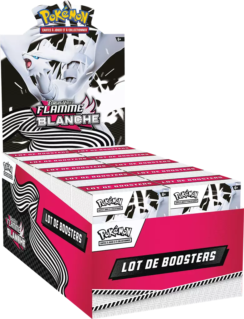 Chaque booster contient 10 cartes de l’extension Flamme Blanche, en français.
