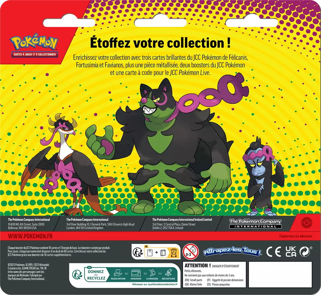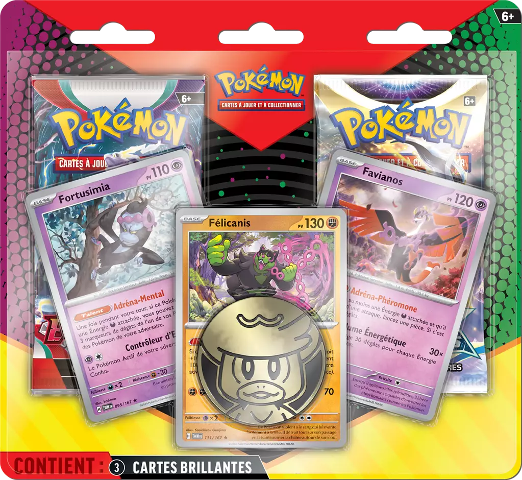 En bonus, ce pack inclut trois cartes promo brillantes mettant en avant Félicanis, Fortusimia et Favianos, de quoi ajouter une touche unique à votre collection. Et pour ajouter une touche encore plus exclusive, une pièce de jeu à l’effigie de Coiffeton est incluse, idéale pour vos parties et vos duels Pokémon.
