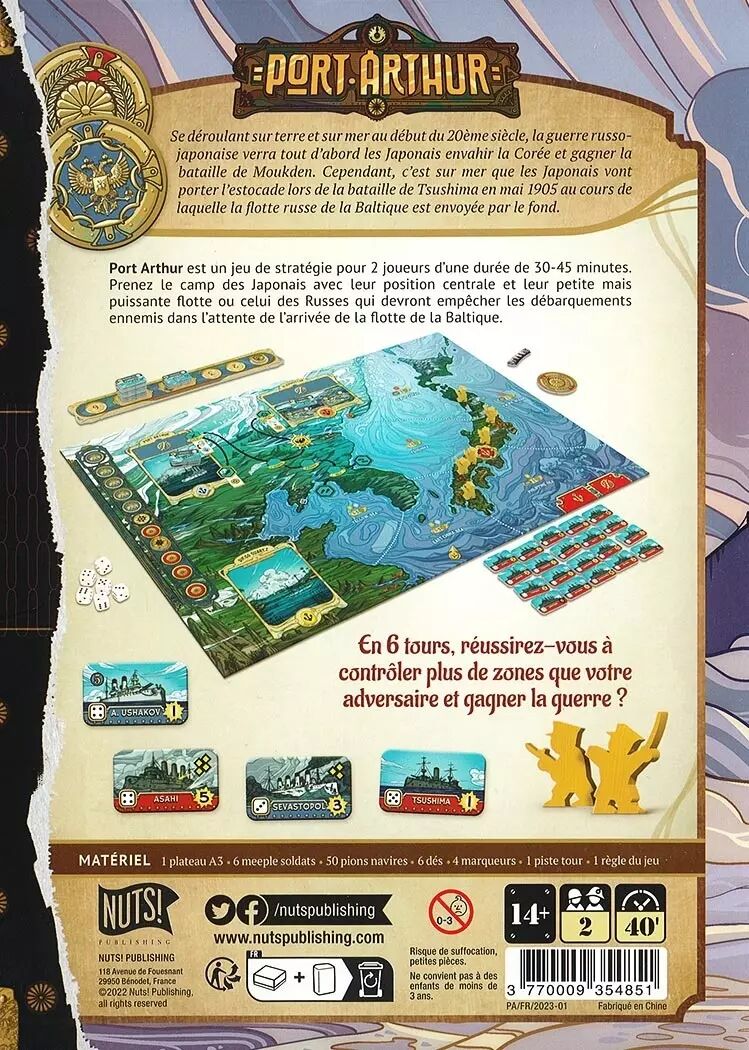 Port Arthur propose un contenu riche et immersif, avec un plateau de jeu détaillé, des pions représentant les navires et les troupes, des dés et des cartes pour les événements spéciaux. Les composants sont de qualité et contribuent à l'ambiance immersive du jeu.
