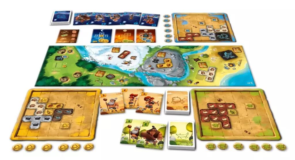 Placez les tuiles Animal sur le plateau principal puis choisissez des objectifs pour la partie. Chaque joueur prend les 12 cartes du clan de son choix puis place devant lui sa grotte et les jetons totem correspondants. Chaque joueur pioche les 3 premières cartes de sa pile, c'est sa main de départ. Pour récupérer les tuiles Animal, il va falloir atteindre le score minimal indiqué devant chaque tuile Animal. Les joueurs choisissent simultanément parmi les cartes de leur main les chasseurs qu'ils souhaitent envoyer. Le joueur avec le plus petit total joue en premier car ses chasseurs sont les plus rapides. Le chasseur avec le plus grand total pourra chasser davantage ou de plus gros animaux mais, en étant le plus lent, il n'est pas certain qu'il restera encore quelque chose dans la vallée à son tour. Lors de la chasse, vous pouvez choisir entre chasser sans blessure ou avec blessure. Si le total des cartes Chasseur atteint le nombre indiqué par la flèche verte, la chasse est réussie sans blessure, vous récupérez la tuile Animal et vous piochez deux cartes de votre clan pour reconstituer votre main. Si le total des cartes Chasseur d'un joueur n'atteint que le nombre - plus faible - indiqué par la flèche orange, la chasse est réussie mais le joueur est blessé. Il récupère la tuile Animal mais revient affaibli de la chasse. Il ne récupère alors qu'une seule carte pour reconstituer sa main. Deux blessures ou plus et il ne récupère aucune carte pour le prochain tour. Au retour de chaque chasse, le Chaman va peindre vos exploits en plaçant la ou les tuiles Animal récupérée(s) dans votre grotte. Peignez au mieux, pour répondre aux exigences fixées en début de partie par les esprits des Anciens. Il faudra donc anticiper les chasses nécessaires pour celles-ci. Lorsque vous réalisez un (ou plusieurs) objectifs, placez le nombre de jetons Totem indiqué sur la carte Objectif correspondante. Le premier joueur à placer ses 8 jetons Totem remporte la partie !