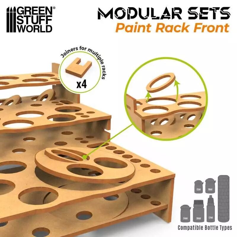 Présentoir de bouteilles de peinture fabriqué en bois MDF de haute qualité. L'assemblage pour ce présentoir est rapide et simple. Si vous souhaitez le renforcer, nous vous recommandons d'utiliser une colle blanche Standard. Cet ensemble comprend des pièces de connexion pour pouvoir le joindre à d’autres modules à gauche et à droite. Il est également compatible avec les modules de tiroir GSW.