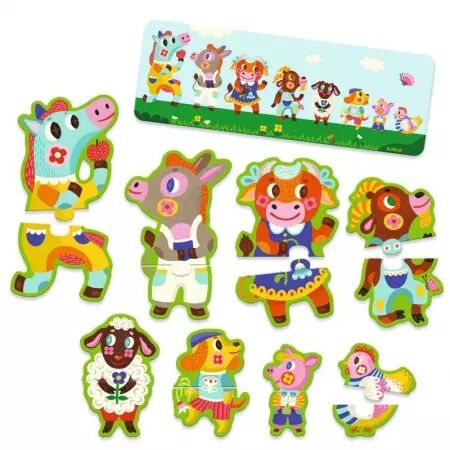 L'enfant reconstitue les 8 puzzles de 2 pièces silhouettées de différentes tailles qui forment 8 animaux de la ferme très colorés. Une fois réalisés, la carte-modèle indique comment les ranger, du plus grand au plus petit.