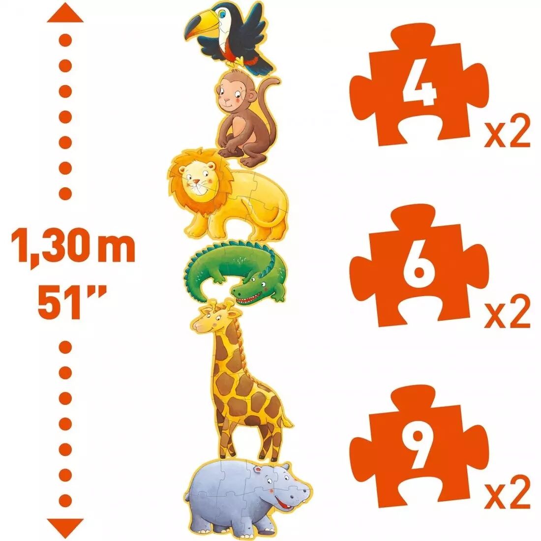 Le coffret comprend 6 puzzles géants, évolutifs et silhouettés de 4, 6 et 9 pièces, des puzzles de difficulté croissante sur le thème des animaux de la jungle : une girafe, un hippopotame, un lion, un crocodile, un singe et un toucan. L'enfant progresse à son rythme en fonction du nombre de pièces par puzzle.