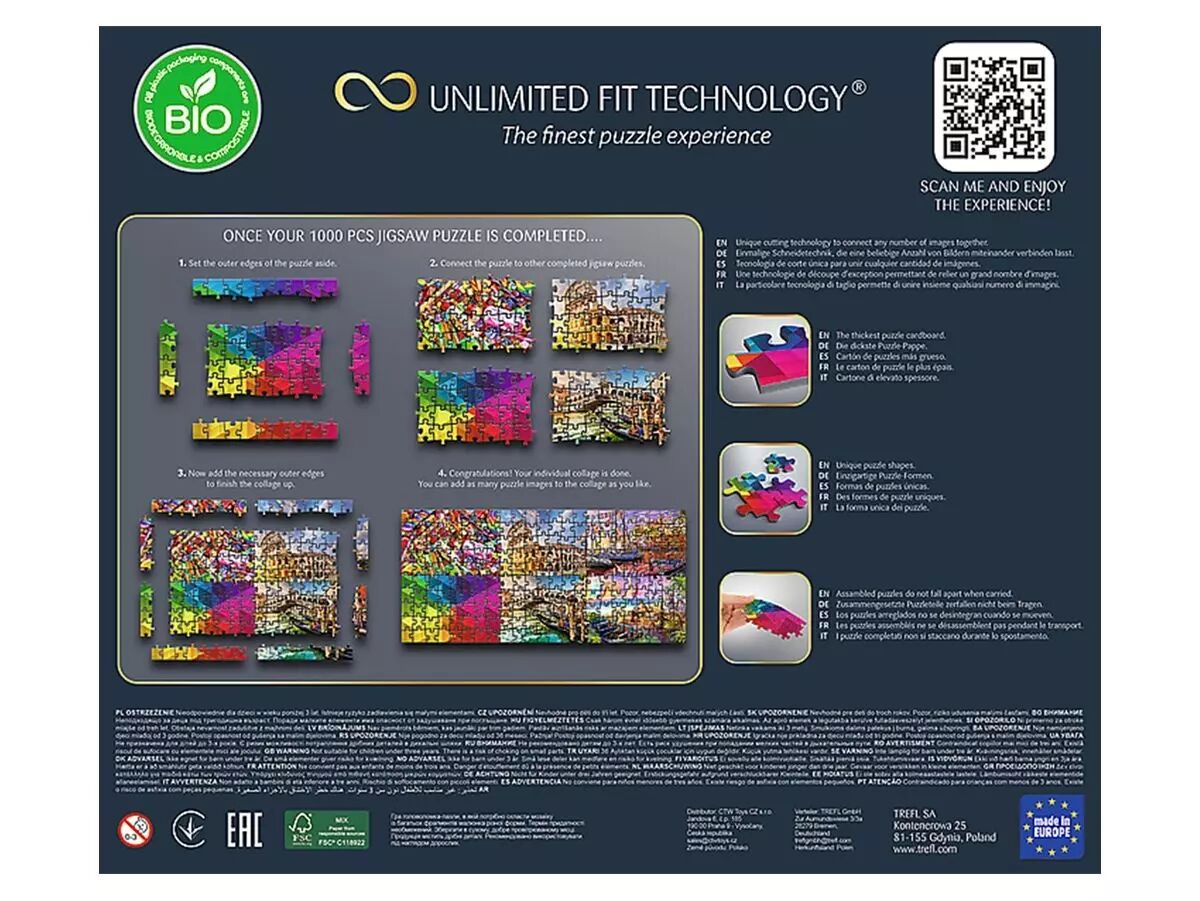 Chaque puzzle peut être assembler avec un autre puzzle de la marque Trefl Prime. En effet, la méthode de fabrication des pièces permet de combiner n'importe quel nombre de puzzles en une seule grande composition. Pour se faire, il suffit de retirer la dernière rangée de pièces extérieures de chaque puzzle pour que les puzzles s'imbriquent parfaitement ensemble. Vous pourrez créer ainsi des compositions uniques !