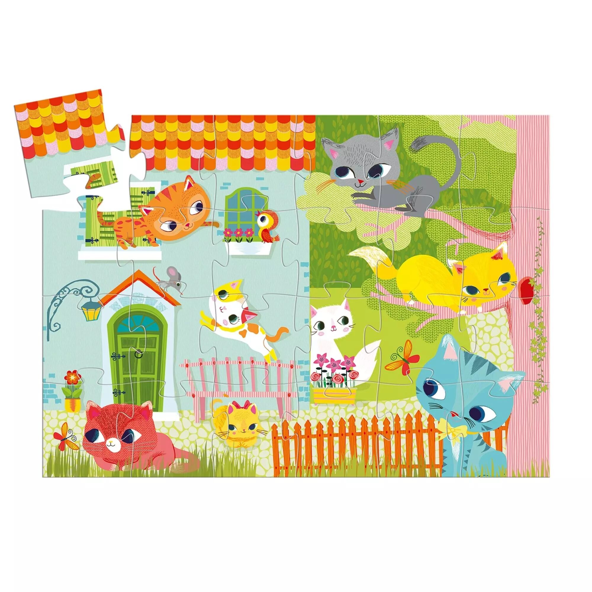 Le puzzle Djeco 24 pièces Pachats et ses amis est un puzzle silhouette pour les enfants à partir de 3 ans. Ce puzzle coloré et ludique représente le petit chat Pachat, qui a invité ses amis chatons à venir jouer dans sa maison. Perchés sur les branches d'un arbre, ou taquinant les oiseaux et les souris, les adorables chats s'amusent et amusent bébé ?