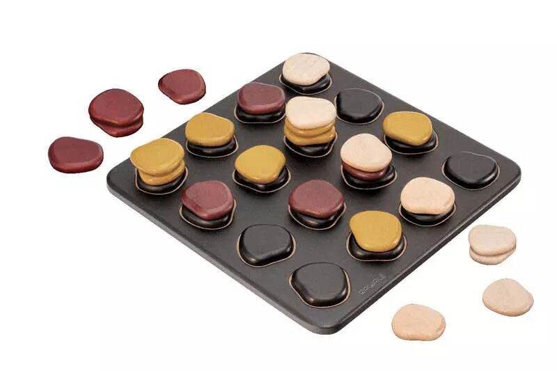 Simple et tactique à la fois, Qawale trouve son inspiration dans les piles de galets que l'on trouve au bord des chemins. À l'image de ces pierres qui voyagent, placez un galet au sommet d'une pile avant de l'égrener sur les cases du plateau. Formez une ligne de 4 galets à votre couleur pour remporter la partie.