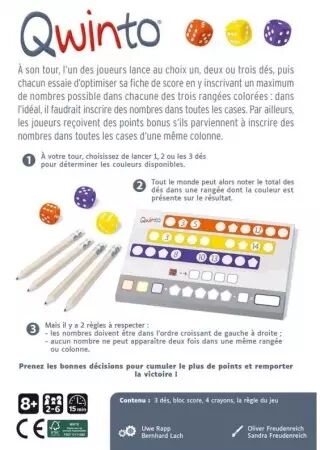 Dans QWINTO, tous les lancers profitent à tous les joueurs, mais chacun s'en sert à sa manière pour compléter sa propre fiche de score. A son tour, l'un des joueurs lance au choix un, deux ou trois dés. Tout le monde peut alors inscrire le total obtenu dans une rangée dont la couleur est identique à celle de l'un de ses dés lancés. Mais attention à bien respecter les deux règles d'or : dans les rangées, les nombres doivent respecter un ordre de valeur croissant de gauche à droite. Et aucun nombre ne doit apparaître deux fois : ni dans les rangées, ni dans les colonnes ! Dès qu'un joueur a complété deux rangées, la partie prend fin et on procède au décompte des points.