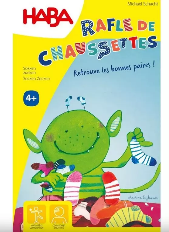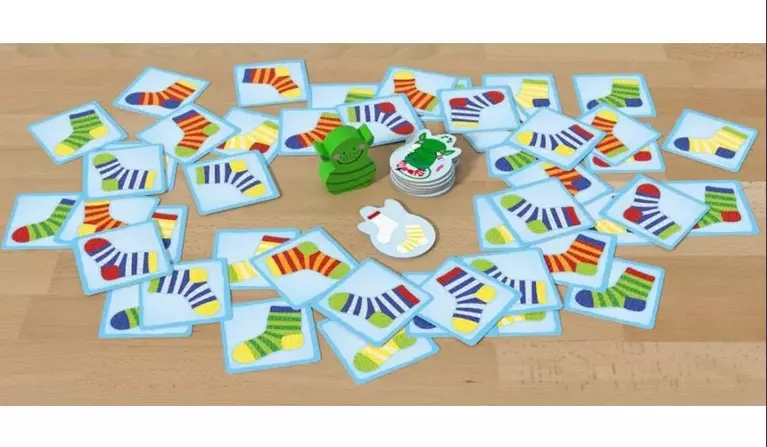 Jeu d'observation et de rapidité pour assortir les chaussettes! On place les cartes chaussettes en vrac sur la table et on pose le monstre des chaussettes au milieu. Au top départ tous les joueurs, avec une seule main, fouillent les cartes pour assembler des paires de chaussettes strictement identiques (elles se ressemblent beaucoup). Le premier qui pense avoir rassemblé 5 paires de chaussettes attrape le monstre. Si ses paires sont bien identiques il gagne une tuile monstre. Le jeu se joue en autant de manches que de tuiles montres disponibles. Un jeu amusant, tout simple et facilement modulable, pour travailler la discrimination visuelle.
