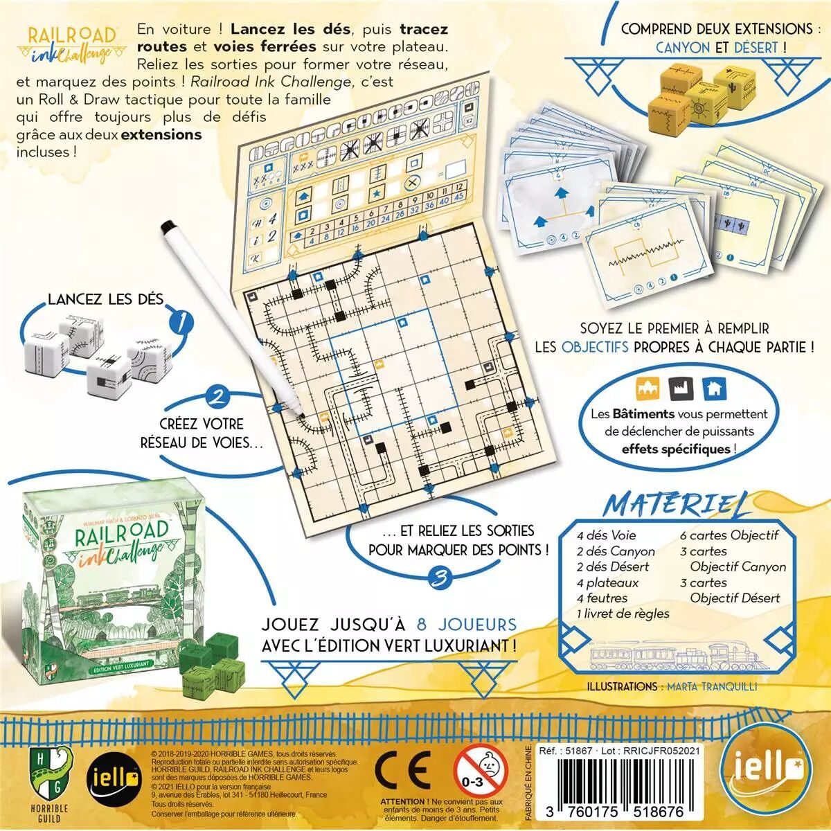 Réf. : 51867 En voiture ! Lancez les dés, puis tracez routes et voies ferrées sur votre plateau. Reliez les sorties pour former votre réseau, et marquez des points ! Railroad Ink Challenge, c'est un Roll & Draw tactique pour toute la famille qui offre toujours plus de défis grâce aux deux extensions incluses!