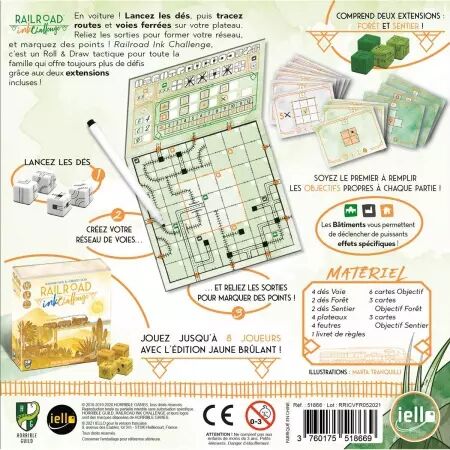 Railroad Ink Challenge existe en deux versions, chacune comprenant une extension avec un jeu de dés supplémentaire qui ajoute de nouvelles règles spéciales à vos parties. Créez des paysages de forêt paisibles et construisez un magnifique paradis sylvestre avec l'édition verte !