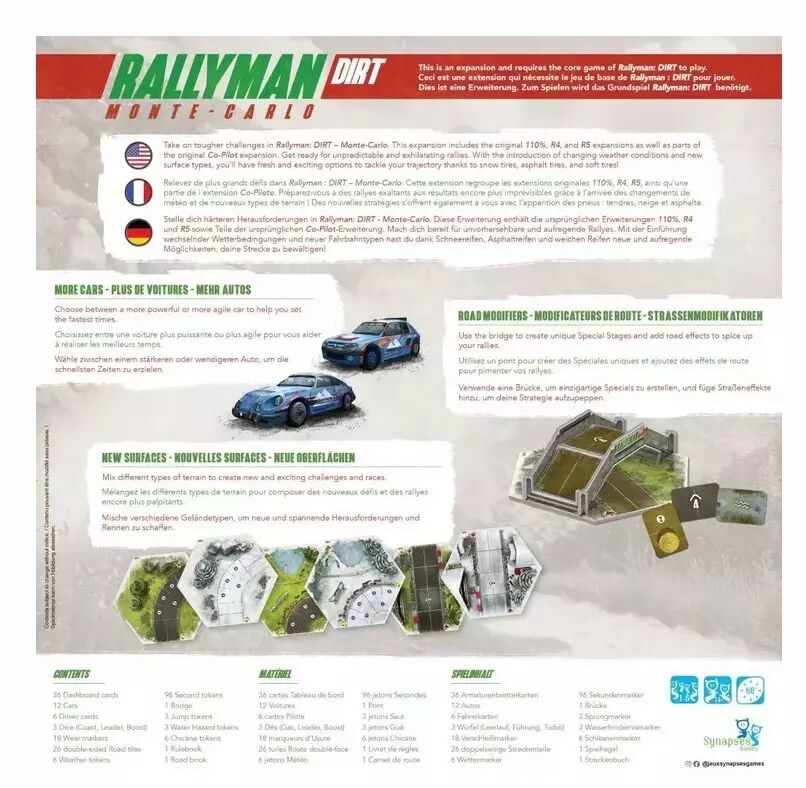 Relève toujours plus de challenge dans Rallyman : DIRT – Monte Carlo. Dans cette première extension regroupant les extensions originales 110%, R4, R5, ainsi qu’une partie de Co-Pilote, le monde du rallye est en pleine évolution. Prépare-toi à des spéciales exaltantes aux stratégies encore plus nombreuses grâce à l’arrivée de nouveaux types de terrain. La neige et l’asphalte feront leurs apparitions au même titre que les pneus tendres ou les pneus d’hiver.