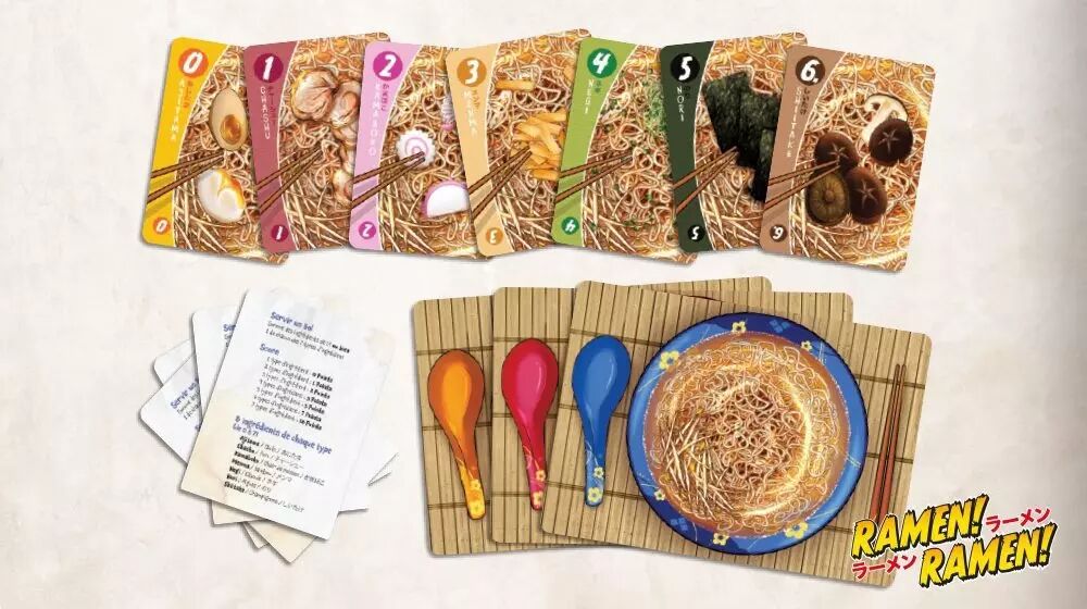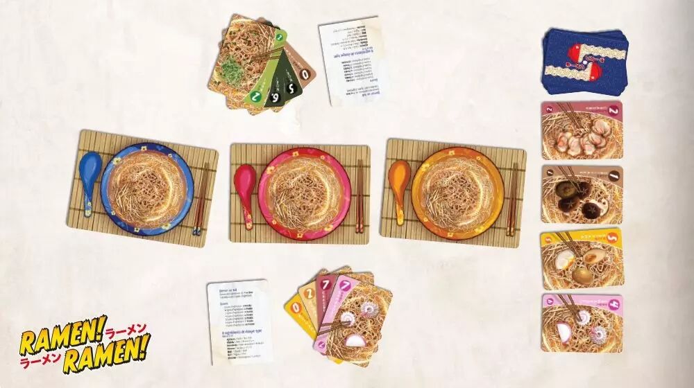 À chaque tour, les joueurs ajoutent des ingrédients aux bols de ramen qui attendent d'être servis, en essayant d'accumuler le plus grand nombre de points avant de servir, tout en essayant de ne pas donner à leur adversaire l'occasion de voler les points ! Une fois que la pioche est vide, les joueurs se précipitent pour finir les bols, puis comptent les points pour voir qui est le meilleur chef ramen.