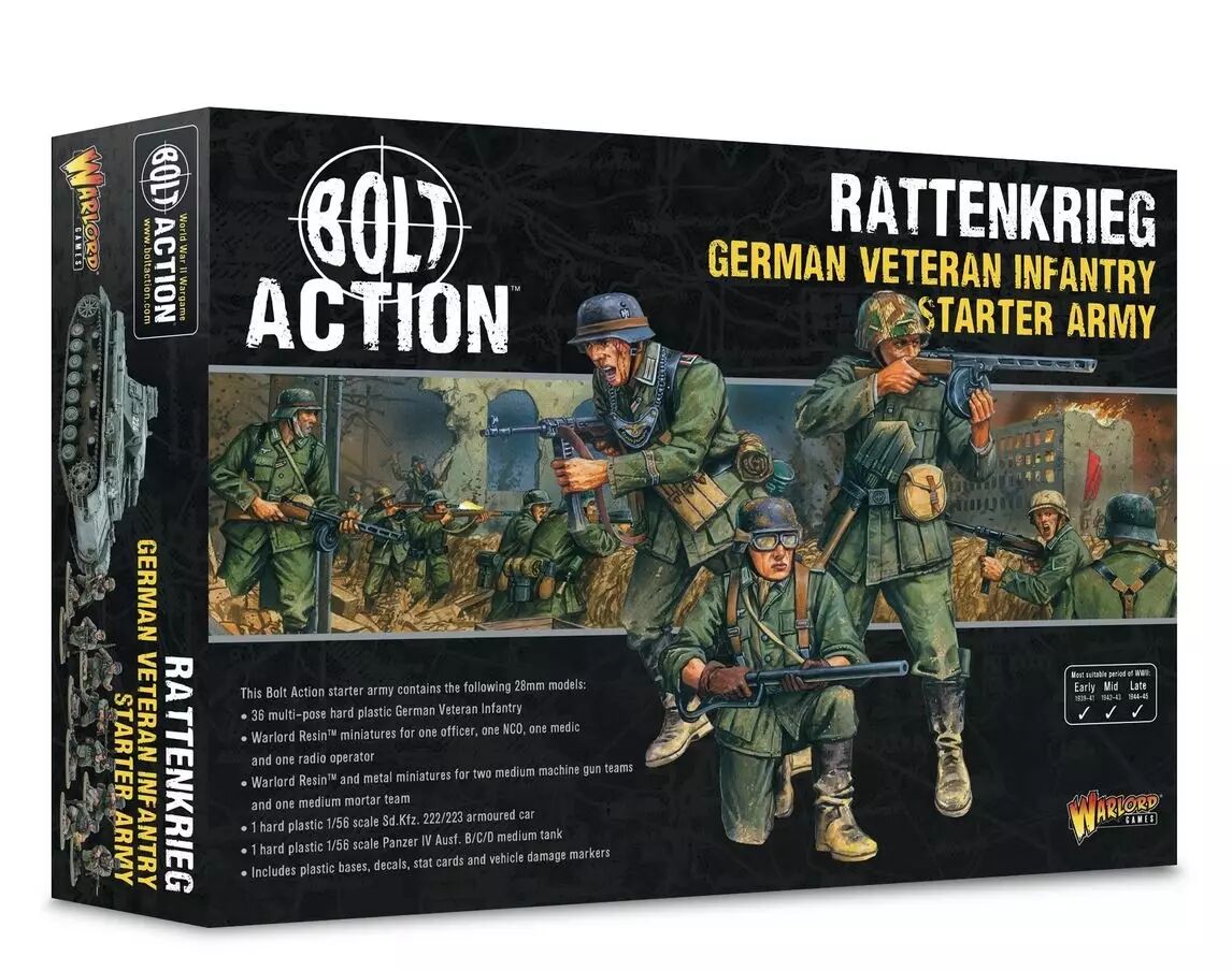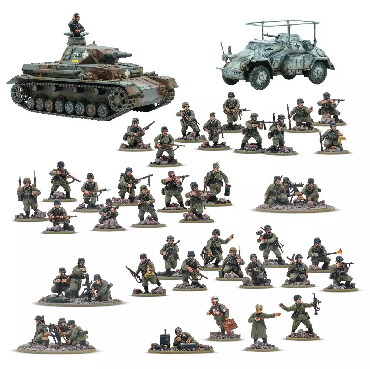 Ce set massif fournit une armée de 1000 points et plus, prête à être assemblée pour représenter une force allemande de milieu ou fin de guerre (Mid/Late War) :