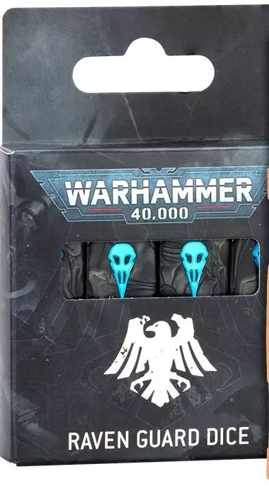Réf. : 55-62 Les dés de la Raven Guard sont d'un noir nacré avec des marquages bleu pâle et l'icône du Chapitre sur la face du six