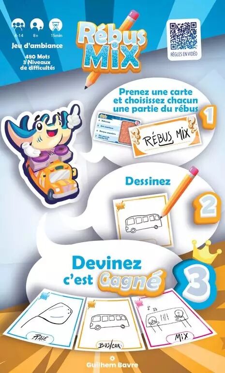 Dans "Rébus Mix", vous serez dessinateur et/ou Rébulogue à tour de rôle. Dans le temps imparti, vous allez devoir ensemble, dessiner et deviner le rébus. 3 degrés de difficultés dans les rébus, tant au niveau du dessin que de l'expression choisie.