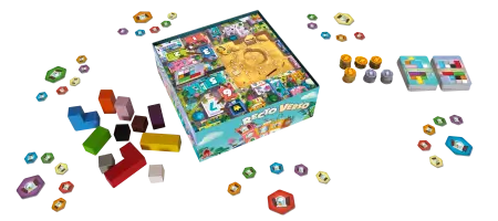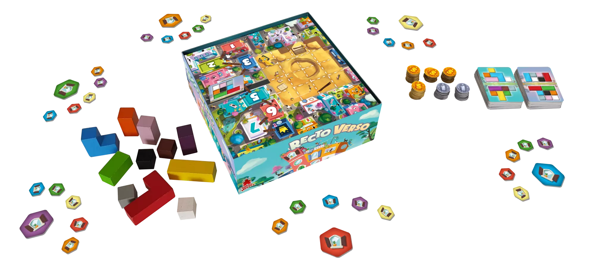 Recto Verso est un jeu abstrait pour 2 à 6 joueurs où ceux-ci doivent reconstituer des formes sur des cartes objectifs