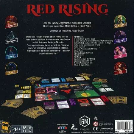 Vous représentez une maison qui tente d'accéder au pouvoir en rassemblant un assortiment d'adeptes (votre jeu de cartes). Red Rising est un jeu de gestion de la main et de construction de combo pour 1 à 6 joueurs (temps de jeu de 45 à 60 minutes).