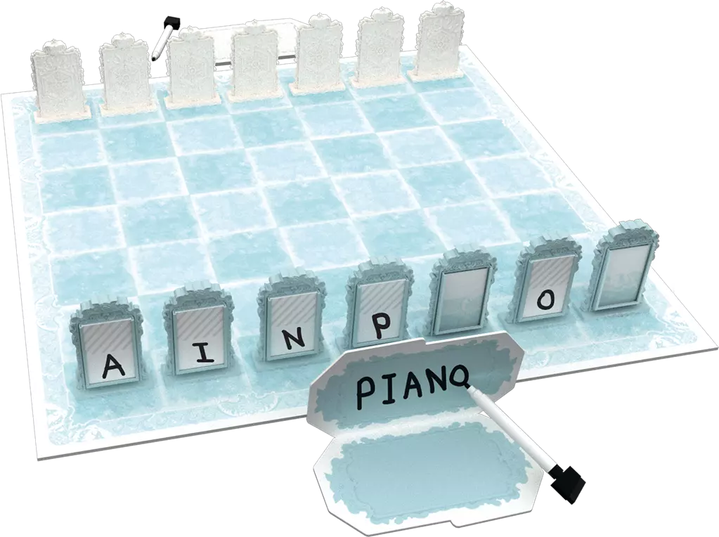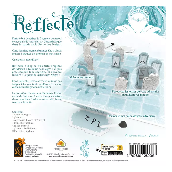 Dans Reflecto, Gerda affronte la Reine des Neiges. Chacune tente de découvrir le mot caché de l’autre grâce à des miroirs. Les deux joueurs disposent de 7 écrans. 5 contiennent chacun une lettre de leur mot, les deux autres sont des miroirs. Déplacez vos écrans contenant une lettre jusqu’à les faire sortir du plateau par le côté opposé au vôtre, et utilisez vos miroirs pour voir les lettres que votre adversaire tente de faire sortir !