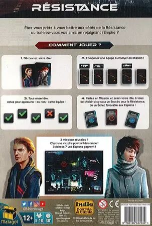 Véritable classique des jeux d'identités secrètes et de déduction sociale, Resistance est un jeu sans élimination. Chaque nouvelle mission commence par une discussion. Lorsqu'il est prêt, le leader choisit l'équipe envoyée en mission. Chacun vote pour approuver ou non cette équipe. Une fois une mission lancée, les agents envoyés décident secrètement de soutenir ou de saboter la mission !