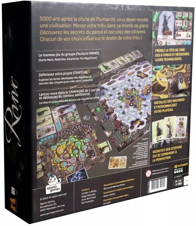 Au début du jeu, chaque joueur reçoit un ensemble de cartes de citoyens, un plateau de tribu, ainsi qu'un énorme plateau de joueur à double couche. Le plateau de la tribu montre les capacités uniques de votre tribu et les anciennes technologies que vous pouvez réapprendre au cours de la partie. Le plateau de jeu à double couche est l'endroit où vous placez vos machines personnalisées et améliorez vos emplacements de cartes.