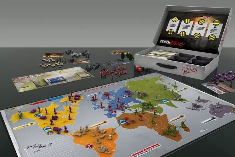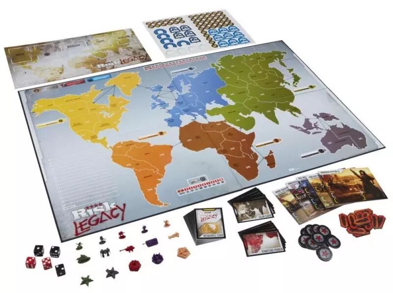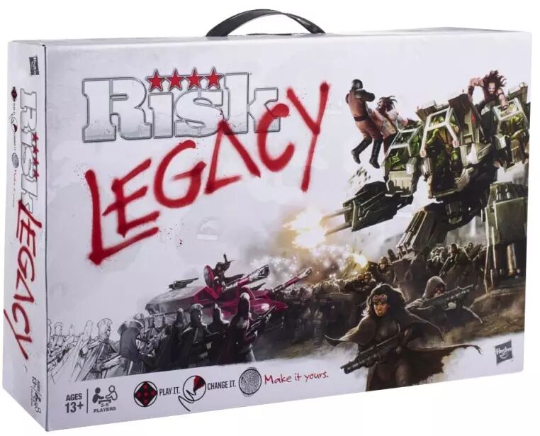 Dans le jeu de stratégie Risk Legacy, chaque partie jouée change les parties à venir. Une décision prise lors de la partie 1 pourrait revenir hanter les joueurs au cours de la partie 10. Les risques pris dans ce jeu sont différent de ceux des autres jeux de coopération. Tous les joueurs modifient la façon dont leur monde évolue : son histoire, ses villes, ses factions et ses combats. Des cartes et des autocollants entrent en jeu. Des cartes sont éliminées du jeu pour toujours. Le peuple n'oubliera pas les trahisons passées, et le jeu non plus. Les joueurs déverrouillent de nouvelles règles et observent le déroulement des événements à chaque nouvelle partie. Aucune partie ne se ressemble. On rassemble ses amis pour un combat de domination captivant dans ce jeu de plateau immersif. Le jeu se joue de 3 à 6 joueurs. Une partie dure environ 1 heure.